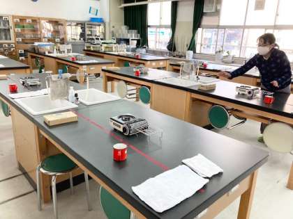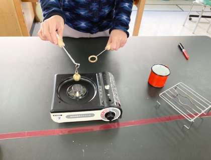 理科室でひとり鍋、いえ、ちがいます。金属を熱するとぼう張することを確かめる実験です。