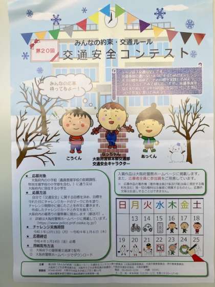 大阪府警察より、交通安全コンテストの案内が届きました。この冬休みに、ぜひチャンレンジしてください。⇒交通安全コンテスト