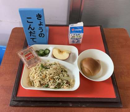 和風焼きそば、きゅうりのしょうがづけ、りんご、2分の1黒糖パン、牛乳 です。