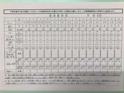 保護者の皆さま、お子さんの検温や健康観察表の記入にご協力くださり、ありがとうございます。明日、続きの観察表をお配りしますので、冬休みも、ご協力のほど、よろしくお願いします。