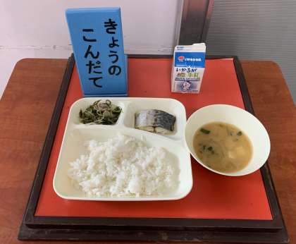 みそ汁、さごしのしょうゆがけたれ、みずなの煮びたし、ご飯、牛乳 です。