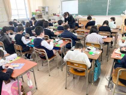 理科担当の東先生が、じしゃくの実験キットを配っています。