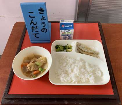 きびなごてんぷら、一口がんもとじゃがいもの煮もの、ブロッコリーのしょうがづけ、ごはん、牛乳 です。