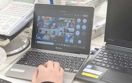 学級休業の4年1組は、家に持ち帰ったタブレット端末(パソコン)で、オンライン学習などをしています。下は、午前10時35分の写真です。4年1組のほとんどの子どもたちが、先生とつながっています。保護者の皆さまのご協力に、感謝申し上げます。