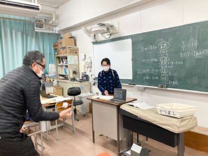 上・中 1組 阿佐先生、鎌田先生 体つくりの運藤を紹介しています。保護者の皆さまのご協力で、スムーズにオンライン学習が進んでいます。