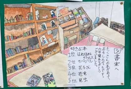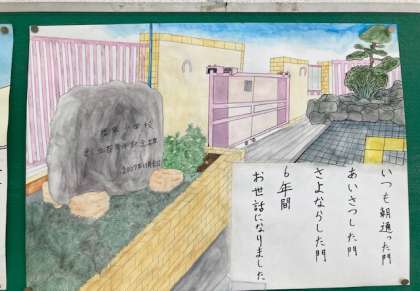 思いでの校舎とメッセージです。一人ひとりの作品を見ると、ウルっとしてきます。もう少しだけ、6年生のままでいてくださイギー