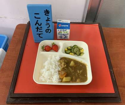 チキンレバーカレーライス、きゅうりとコーンのサラダ、いちご、牛乳 です。