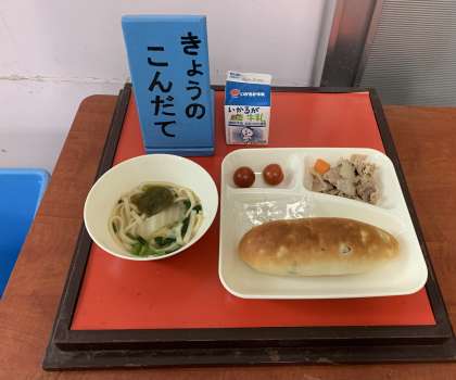 豚肉と野菜の煮もの、なにわうどん、プチトマト、おさつパン、牛乳 です。