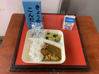 チキンカレーライス、ビーンズサラダ、アーモンドフィッシュ、牛乳 です。