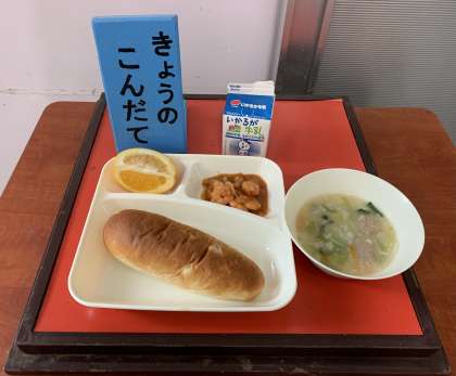 えびのチリソースいため、中華がゆ、はっさく、おさつパン、牛乳 です。