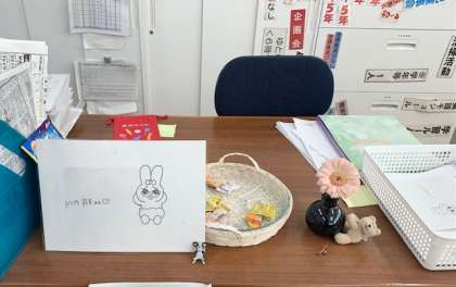 投稿者の机です。例のうさぎキャラのイラストをラミネートまでして、立てかけてくださっています。ありがとうございます(笑)
