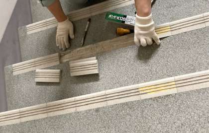 管理作業員の日野さんです。はずれかかっている階段のタイルを、ていねいに補修してくださっています。いつもありがとうございます。