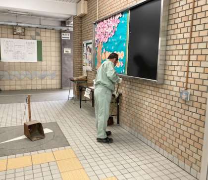 上 今朝、7時30分すぎ。管理作業員の日野さんが、玄関を清掃してくださっています。