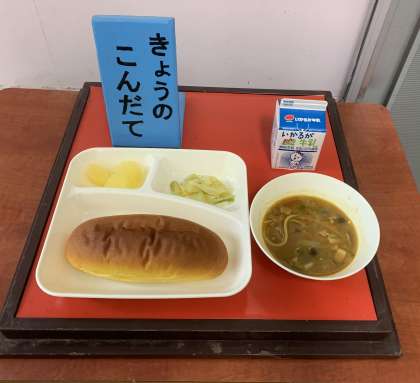 カレースープスパゲティ、キャベツのピクルス、りんご(カット缶)、パンプキンパン、牛乳 です。