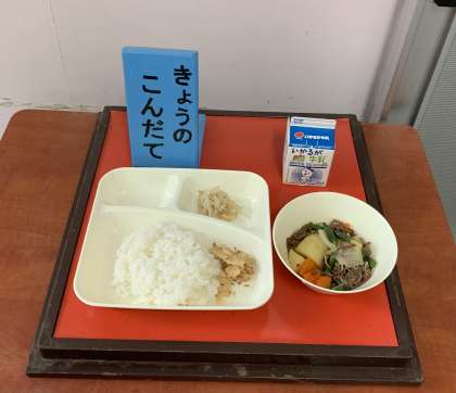 肉じゃが、もやしのゆずの香あえ、ごまかかいため、ごはん、牛乳 です。