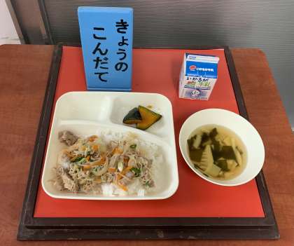 豚丼、湯葉のすまし汁、かぼちゃのしょうゆ焼き、牛乳 です。