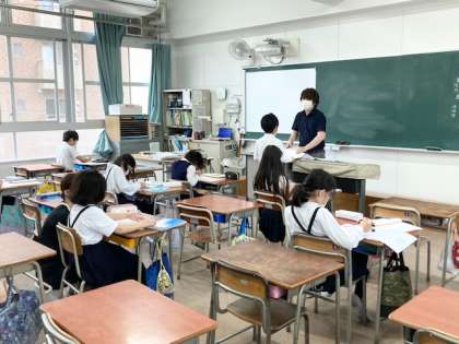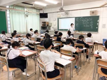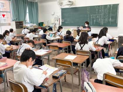 上・中 1組 吉田先生、鎌田先生 2グループに分けて算数の学習