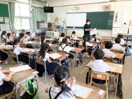 2組 出本先生 遠足のしおりを説明します