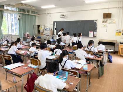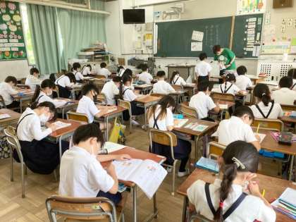 3組 酒井先生 国語ノートをみています