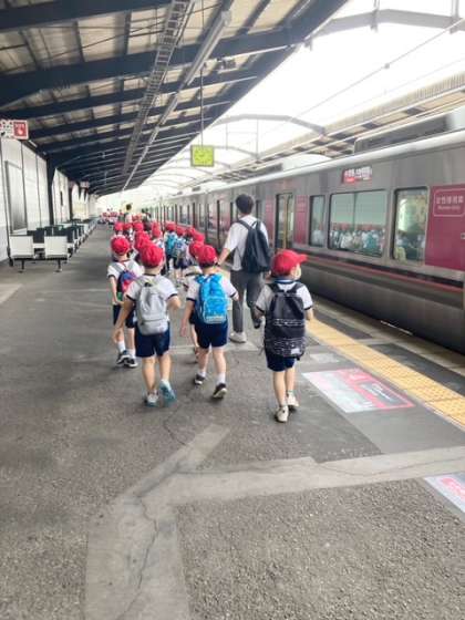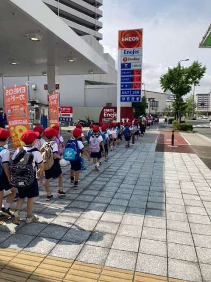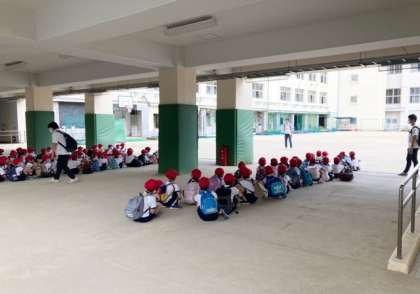 ピロティに集まって、先生のお話をきいています。そして、いよいよ出発です。