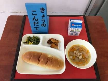 鶏肉のカレーマヨネーズ焼き、てぼ豆のスープ、さんどまめとコーンのサラダ、おさつパン、牛乳 です。
