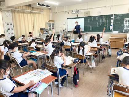 1組 習字をしています。筆を持つ手が、きんちょうする〜