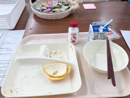 職員室で、おいしい給食をいただきました。午後からも、がんばります!