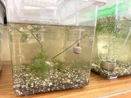 上:メダカちゃんたちは、夏休みの間、職員室にいます。
