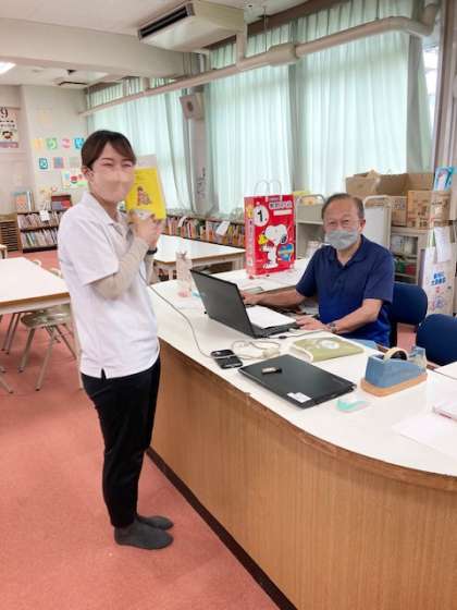 学校図書館主任の木下先生と学校司書の小前先生が、図書室にある本のたな卸しをしてくださいました。塩草立葉小学校の図書館には、現在8,689冊の本があります。