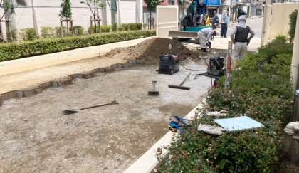 南門出入口の土が、雨などで流出しやすく、近隣の皆様にご迷惑をおかけしていました。