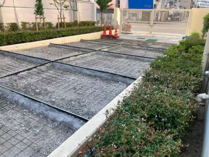 運動場と南門の間をコンクリートで固める工事が進んでいます。作業員の皆さま、暑いところをありがとうございます。