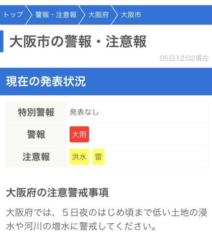 12時2分、大阪市に大雨警報、洪水注意報、雷注意報が発表されました。皆さん、くれぐれもお気をつけてご移動なさってください。