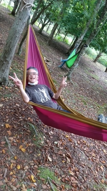 山小屋で地元の食材を使ったお弁当をいただいた後、ハンモックでくつろぎました。揺れが心地よく、やさしい布に包まれていると、安心という言葉が浮かびました。