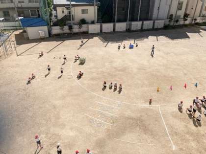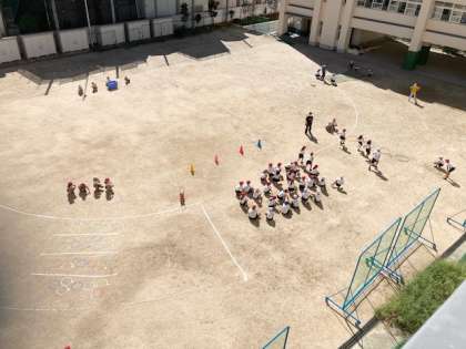 1時限目、運動場で障がい物走