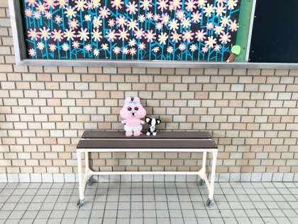 今朝、管理作業員の日野さんと教育実習生の丸山さんが、玄関で子どもたちを迎えてくださいました。下は、日野さんが作ってくださった善意のイスです。うさぎとイギーは、ついていません(笑)