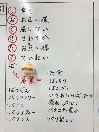 昨日アイデアを募った、「しおくさたてば」の「ば」に素晴らしいことばを寄せていただきました。心優しい保護者様、他校の塩草立葉小学校ファミリー様、滝感謝です!