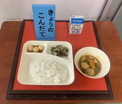一口がんもとさといものみそ煮、牛肉と野菜のいためもの、みたらしだんご、ごはん、牛乳 です。