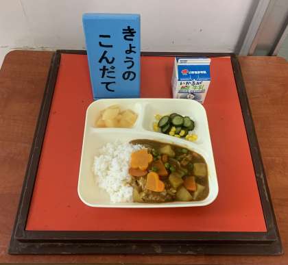 チキンカレーライス【米粉】、きゅうりとコーンのサラダ、白桃(カット缶)、牛乳 です。