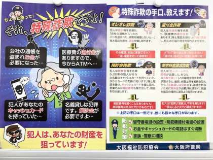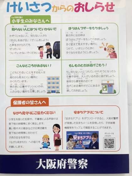 昨日、大阪府警察よりチラシをいただきました。今日子どもたちに配りますので、ご家庭で話題にしてください。