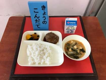 和風ハンバーグ、みそ汁、かぼちゃのいとこ煮、ごはん、牛乳 です。