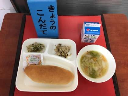 豚肉のカレー風味焼き、はくさいのスープ、もやしとピーマンのいためもの、大型コッペパン、アプリコットジャム、牛乳 です。