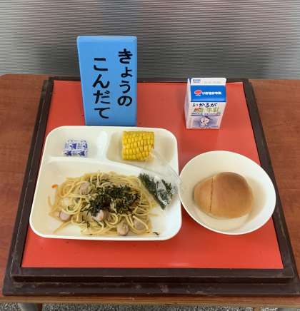 ウインナーときのこの和風スパゲティ、焼きとうもろこし、固形チーズ、黒糖パン2分の1、牛乳 です。