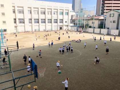 下 1時限目の休み時間の様子です。日差しが優しく、子どもたちの笑顔が輝いています。