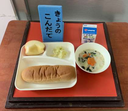 きのこのクリームシチュー、キャベツのピクルス、りんご、黒糖パン、牛乳 です。