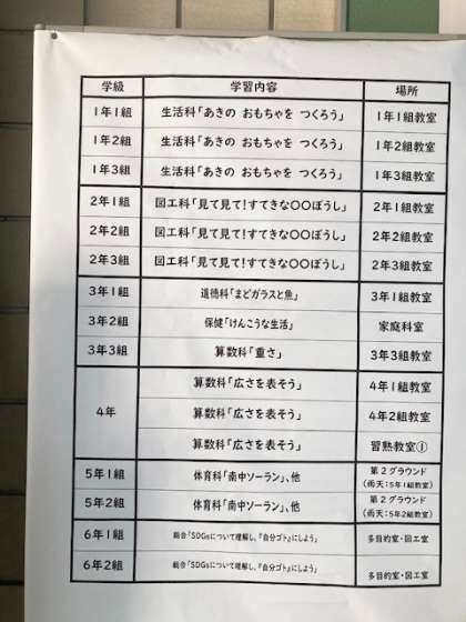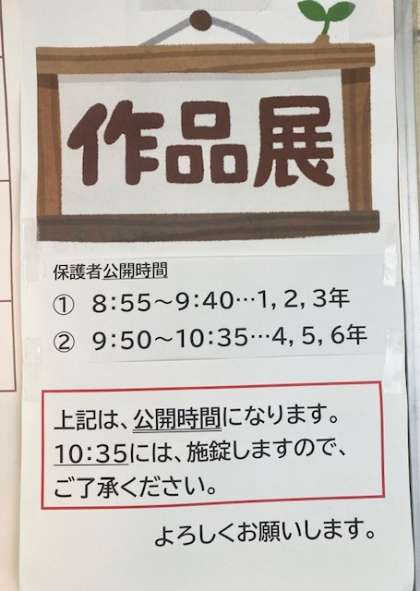 参観は、1時限目(8:55〜9:40)が高学年。2時限目(9:50〜10:35)が低学年です。作品展は、8:55〜10:35です。