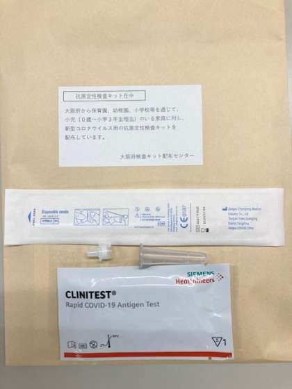 大阪府では、0歳〜9歳の子どもを対象に検査キットの無償配布を開始しました。このたび、教育委員会より一括申込みをした分が届きましたので、今日、1年から3年までのお子さんに2キットを配りました。