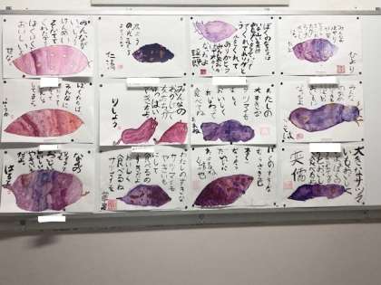 皆さん、こんにちは。写真は、2年生の子どもたちが描いたサツマイモです。自分たちが育てて、収穫し、描いた作品です。子どもらしい、かわいいメッセージに、心がいやされます。