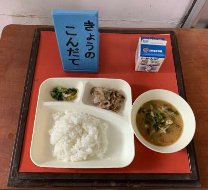 豚肉のしょうが焼き、さつまいものみそ汁、きくなとはくさいのごまあえ、ごはん、牛乳 です。