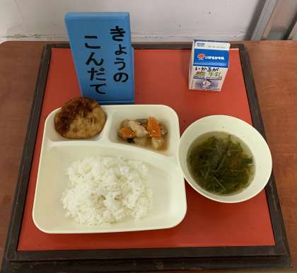 鶏肉の土手焼き風、はりはり汁、れんこんのフライ大阪ソース味、ごはん、牛乳 です。
