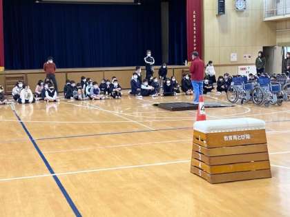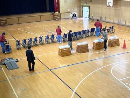 平野区にある大阪市立心身障がい者リハビリテーションセンターより、8名のスタッフの皆さまが車いすを20台近くお持ちくださり、学習を進めていただきました。お忙しいところ、塩草立葉小学校の子どもたちのために、ありがとうございました。